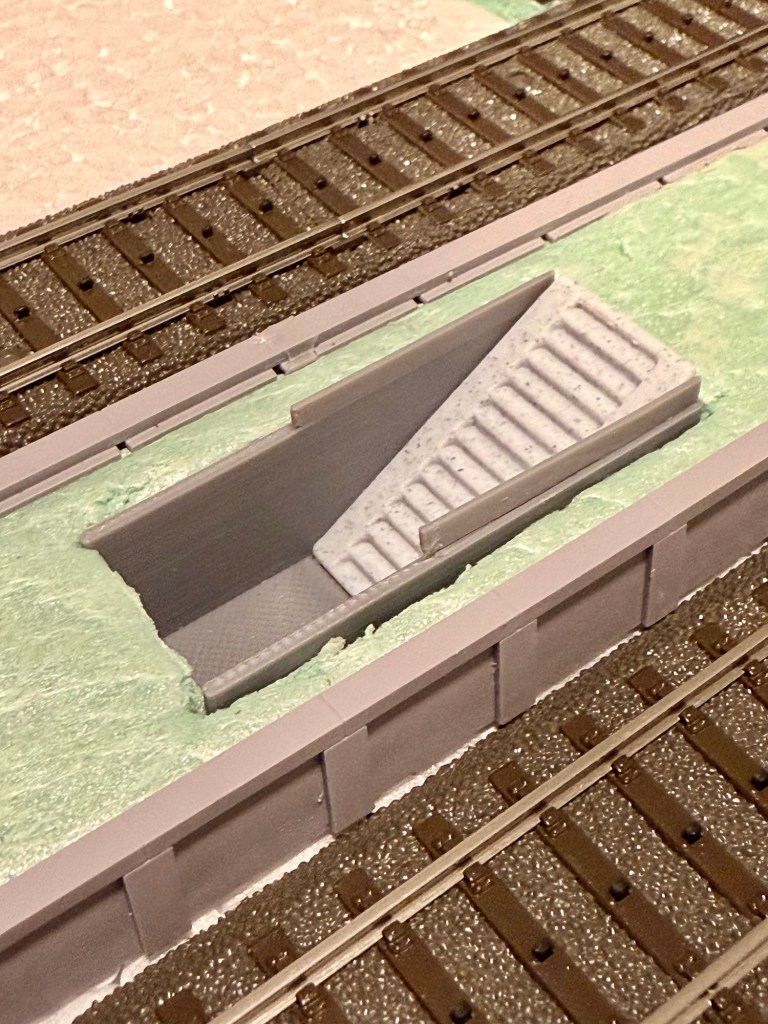 Ich habe lange überlegt wie ich den Zugang zum Bahnsteig realisiere. Zur Auswahl standen abgesenkte Bahnsteige und ein Holzbohlenübergang über Gleis zwei, eine Fußgängerbrücke oder eine Unterführung. Die letzten beiden Optionen sind schwierig zu realisieren, weil der Bahnsteig nur 4 cm breit ist. Letztlich habe ich mich für eine Fußgängerunterführung im 3D-Druck von Make your 3D entschieden, aber Maßstab TT bzw. 1:120. In H0 wäre der Treppenaufgang zu breit für den Bahnsteig. Ich finde aber so geht’s…