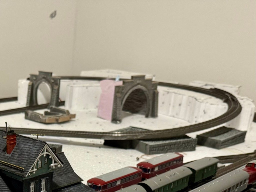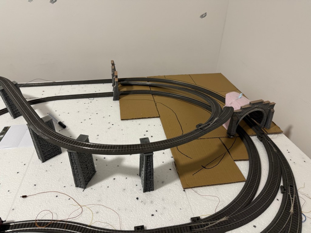 Zuvor habe ich alle Weichen der Ebene 1 angeschlossen. Jetzt fehlt nur noch die Verkabelung für die Weichenlaternen und die Rückmelder. Außerdem habe ich den Unterbau für den Tunnel auf Pappe vorgezeichnet und dann aus einer 8 cm Styroporplatte ausgeschnitten.