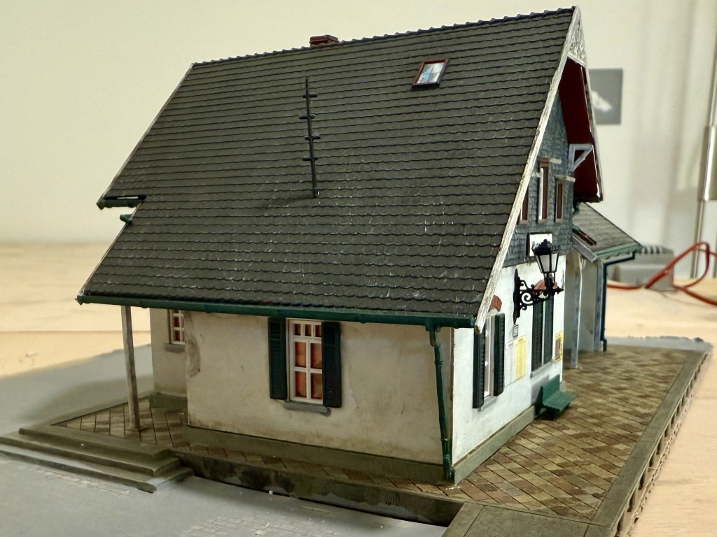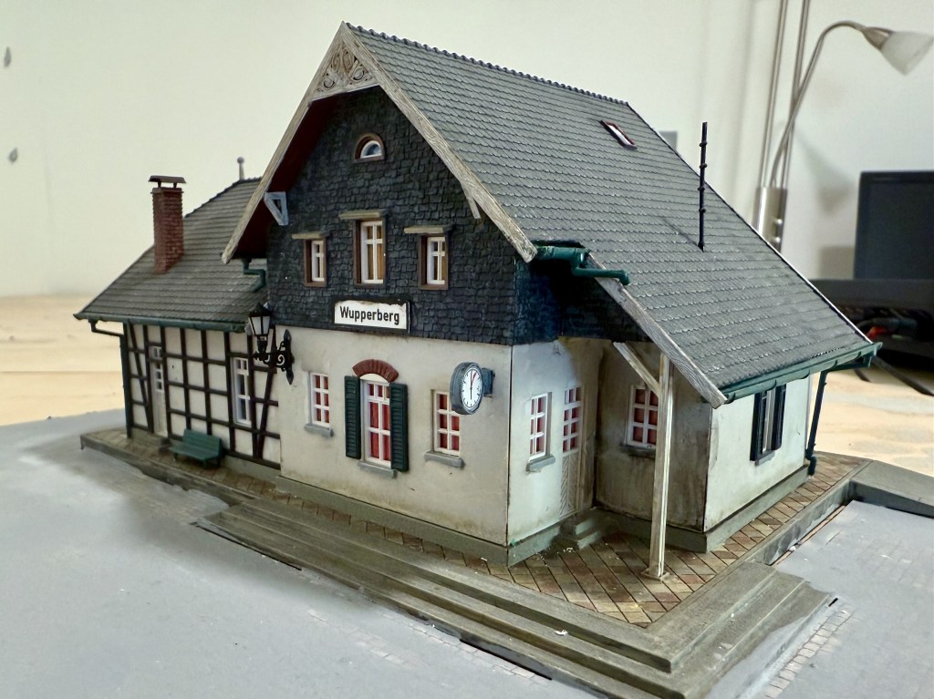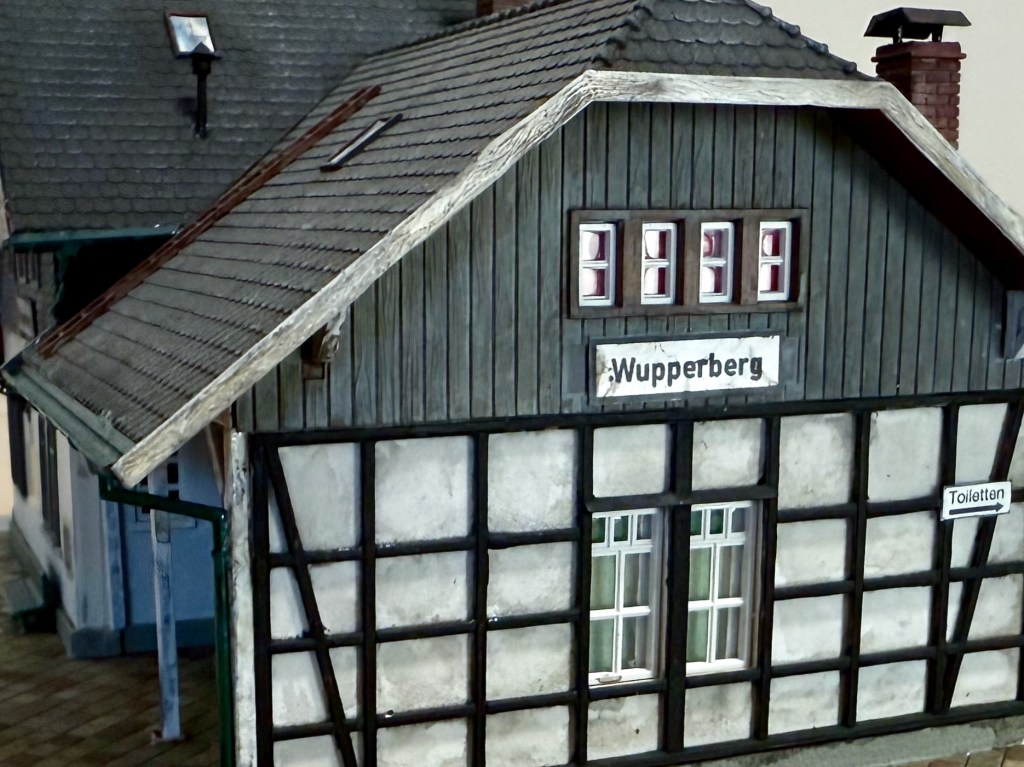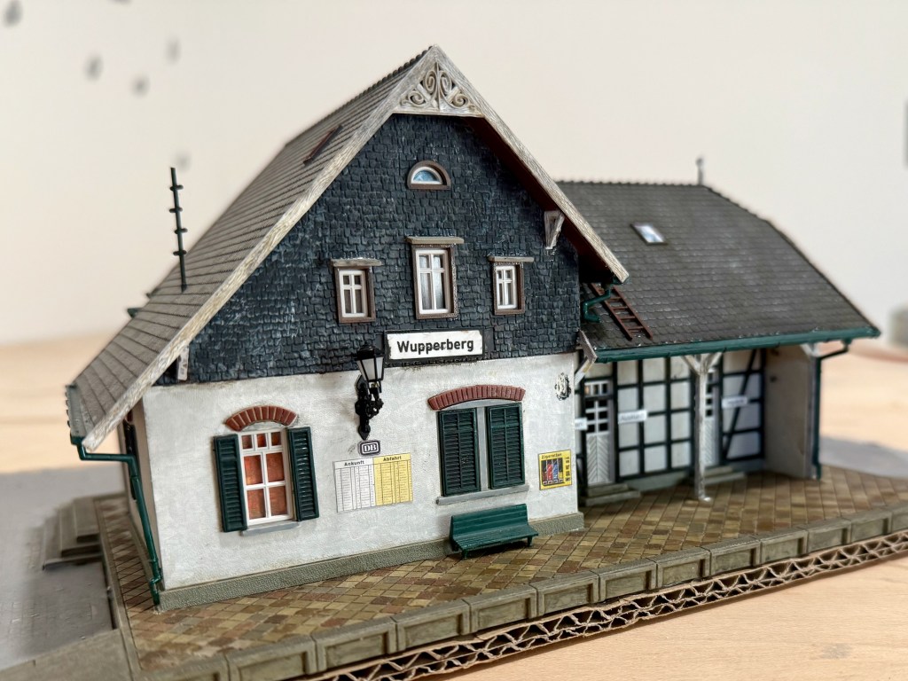 Da dürfen natürlich ein Bahnhof und weitere Gebäude nicht fehlen. Im typisch bergischen Stil gibt es da nicht viel. Die Bausätze von Joswood sind zwar toll, aber ich kann mich mit LaserCut noch nicht so richtig anfreunden. Also war Umkolorierung angesagt…